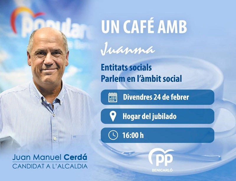 El candidato del PP a la alcaldía de Benicarló, Juanma Cerdá, celebrará el próximo viernes a las 16.00 horas una nueva sesión de su campaña ‘Un café con Juanma Cerdá’. Lo hará con las entidades sociales de la localidad a las que convoca en el Club de la Tercera Edad para “dialogar, conversar, intercambiar ideas y sumar iniciativas que nos permitan diseñar el mejor programa de gobierno para nuestra ciudad”.