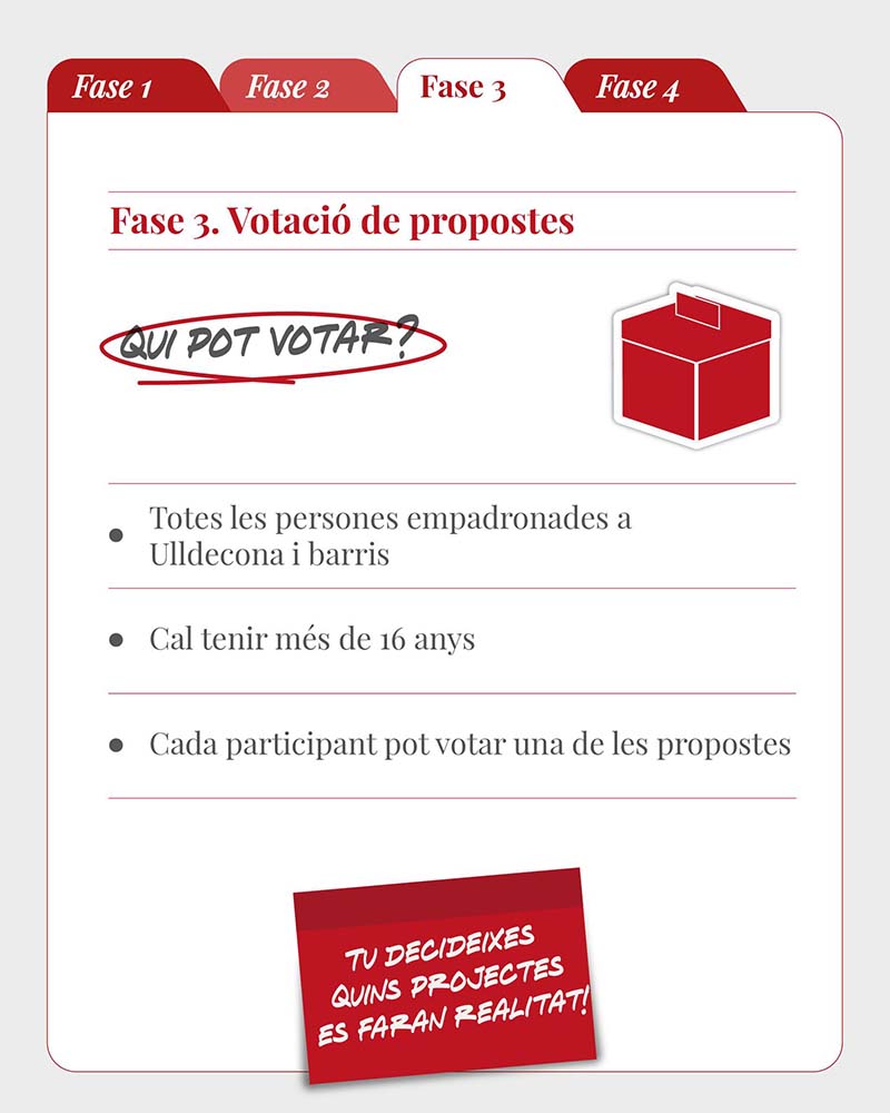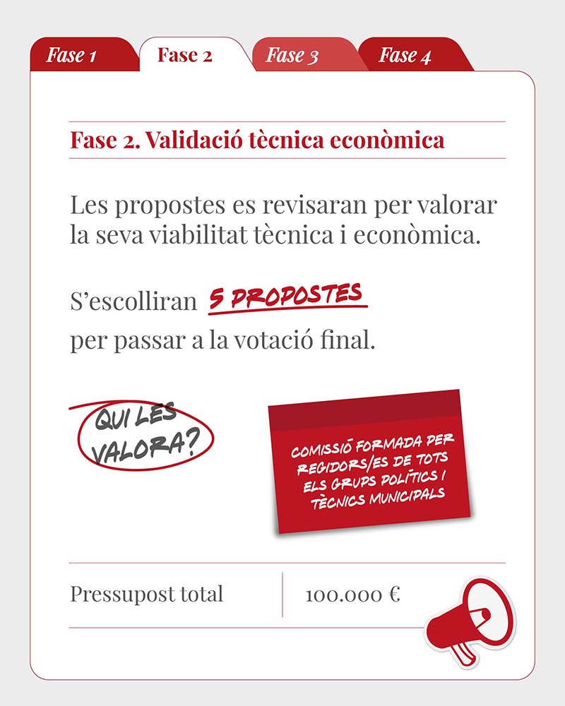 Una vegada finalitzat el termini de presentació, totes les propostes passaran per un procés de validació tècnica i econòmica. D’entre elles, se n’escolliran cinc, que seran sotmeses a votació popular entre totes les persones empadronades al municipi.