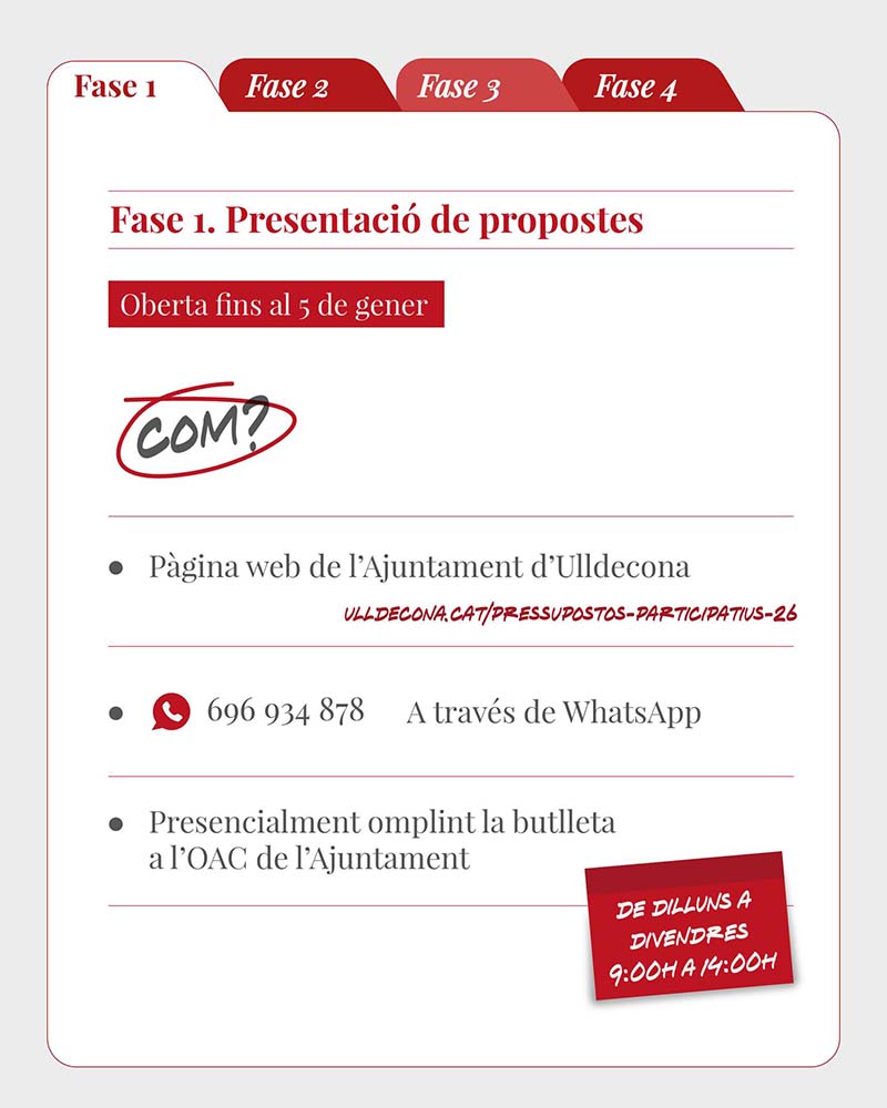 Les propostes es poden presentar fins al 5 de gener mitjançant diverses vies: a través del web municipal (ulldecona.cat/pressupostos-participatius-26/), per WhatsApp al número 696 934 878, o presencialment a l’Oficina d’Atenció Ciutadana (OAC) de l’Ajuntament.