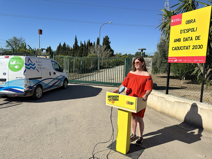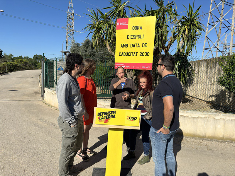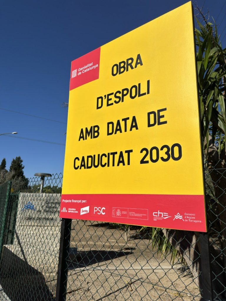 En la mateixa acció, la formació anticapitalista ha plantat un cartell d’obra simulat on s’hi podia llegir: “Obra d’espoli amb data de caducitat 2030”. En el mateix cartell també s’hi podien llegir els logos dels partits de Junts, ERC i PSC, el Ministeri de Transición Ecológica, el de la CHE (Confederación Hidrográfica del Ebro) i el del propi Consorci d’Aigües de Tarragona (CAT), assenyalats com a responsables del transvasament d’aigua de l’Ebre. Al mateix cartell s’hi podia veure un logo de la Generalitat de Catalunya, modificat irònicament amb el nom de “Genialitat de Catalunya”. D’esta manera, la CUP, ha volgut assenyalar als partits, organismes i institucions responsables del transvasament de l’Ebre i alhora, han volgut posar una data simbòlica en la que esta infraestructura es podria tancar amb un pla de retorn de cabals amb prous anys vista.