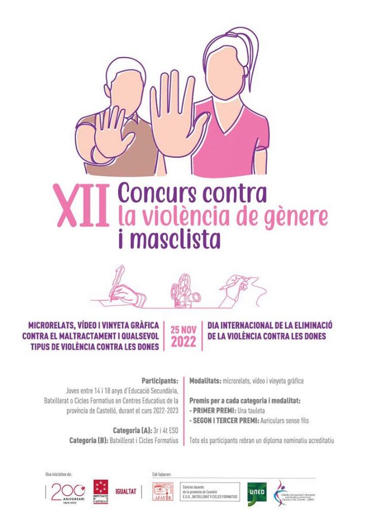 La Diputació de Castelló ha convocat, amb motiu del Dia Internacional de l’Eliminació de la Violència contra la Dona (25 de novembre), el XII Concurs contra la Violència de Gènere i Masclista al qual es podran presentar joves entre 14 i 18 anys d’Educació Secundària o cicles formatius de centres educatius de la província de Castelló, durant el curs 2022-2023.