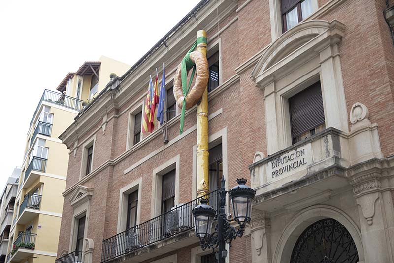 El Palau Provincial es vist de festa amb els elements més representatius de les festes fundacionals de la ciutat: el rotllo, la canya i la cinta verda