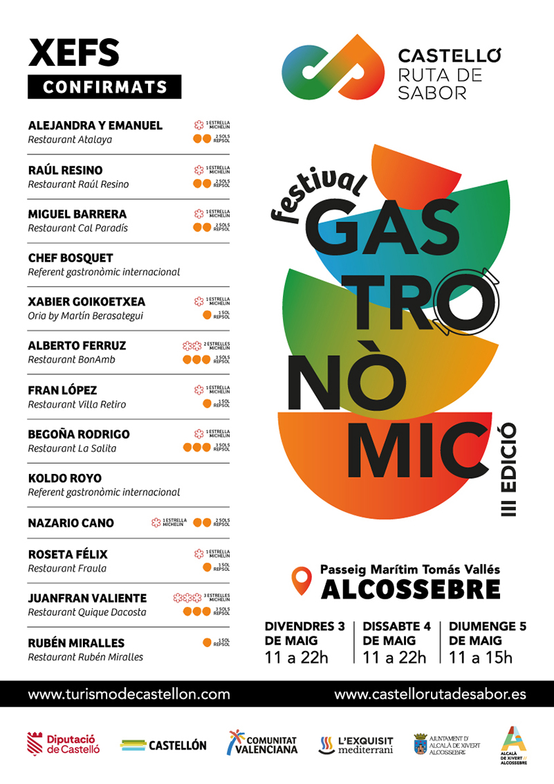 El Festival Gastronómico, tal y como ha anunciado el diputado de Turismo, contará con la participación de chefs de restaurantes que ostentan bien Estrella Michelin, Sol Repsol, o ambos, y el listado lo componen Alejandra y Emanuel (restaurante Atalaya), Raúl Resino (Restaurante Raúl Resino), Miguel Barrera (Restaurante Cal Paradís), Xabier Goikoetxea (Oria by Martin Berasategui), Alberto Ferruz (Restaurante BonAmb), Fran López (Restaurante Villa Retiro), Begoña Rodrigo (Restaurante La Salita), Koldo Royo, Nazario Cano, Roseta Félix (Restaurante Fraula), Juanfran Valiente (Restaurante Quique Dacosta) y Rubén Miralles (Restaurante Rubén Miralles).