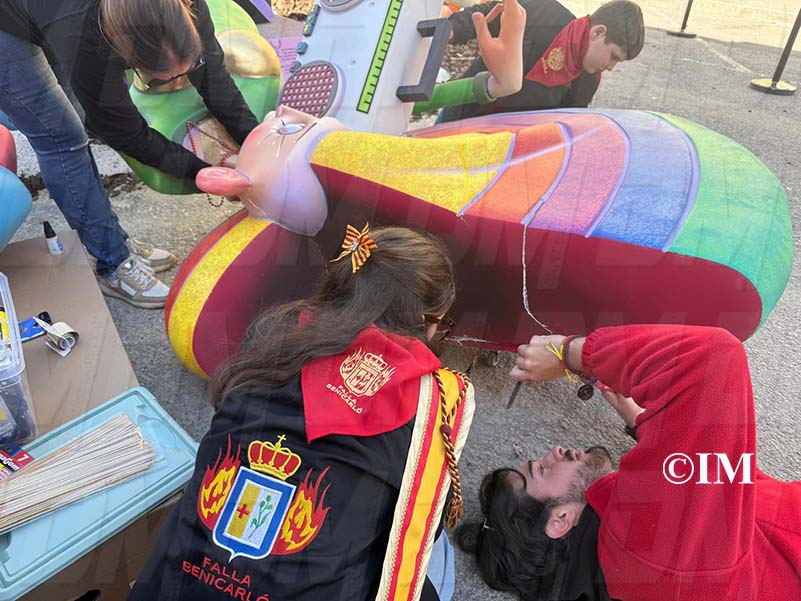 Malgrat aquest contratemps, la comissió fallera ha decidit tornar a alçar el remat, treballant durant tot el dia per recuperar l’aspecte original del monument, que enguany ha aconseguit el primer premi de les Falles de Benicarló 2026.