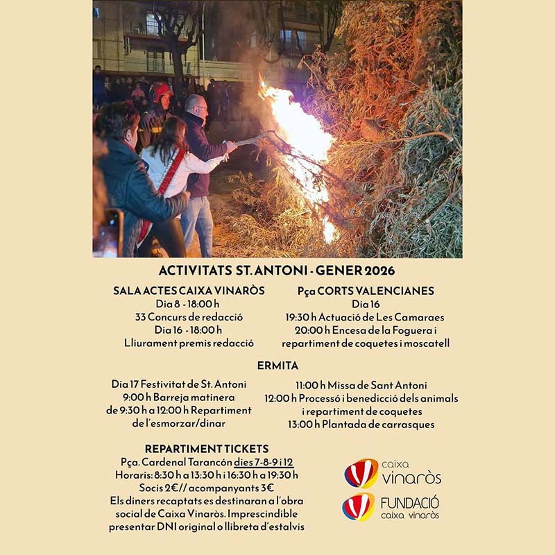La Fundació Caixa Vinaròs ha presentat, a través dels seus canals de difusió, els actes programats per aquest mes de gener, centrats en la festivitat de Sant Antoni, que se celebrarà el proper 17 de gener. Els actes iniciaran el proper 6 de gener a les 11 del matí, amb el tradicional acte d’entrega dels regals de Nadal per part dels Reis Mags a la seu de la Caixa Vinaròs.