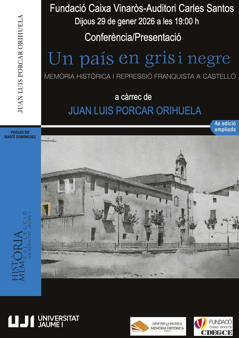 5 dies després, el 29 de gener, es realitzarà a les 19:00 h a l’Auditori Carles Santos la conferència-presentació del llibre “Un Pais En Gris I Negre” a càrrec de Juan Luis Porcar Escorihuela. Recordem que aquesta xerrada s’havia de realitzar el passat mes de desembre, però a causa de les fortes pluges no es va poder realitzar.