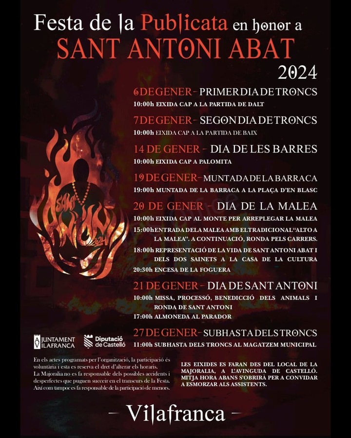 Així doncs, aquesta festa de Sant Antoni es donarà per acabada amb la subhasta dels troncs al magatzem municipal l’últim dissabte de gener. Totes les eixides es faran des del local de la majoralia, a l’Avinguda Castelló, ací s’obrirà mitja hora abans per a convidar a esmorzar als assistents.