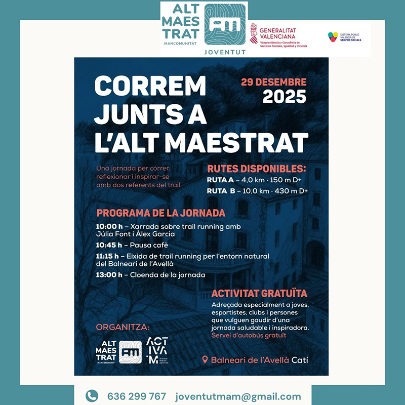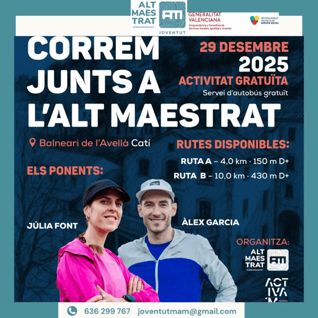 La Mancomunitat Alt Maestrat, conjuntament amb la seva àrea de Joventut, ha presentat a través dels seus canals oficials la iniciativa “Correm Junts A L’Alt Maestrat”, que es realitzarà el proper 29 de desembre a la zona del Balneari de L’Avellà, a la localitat de Catí.