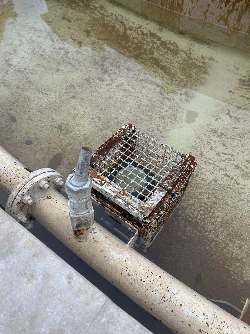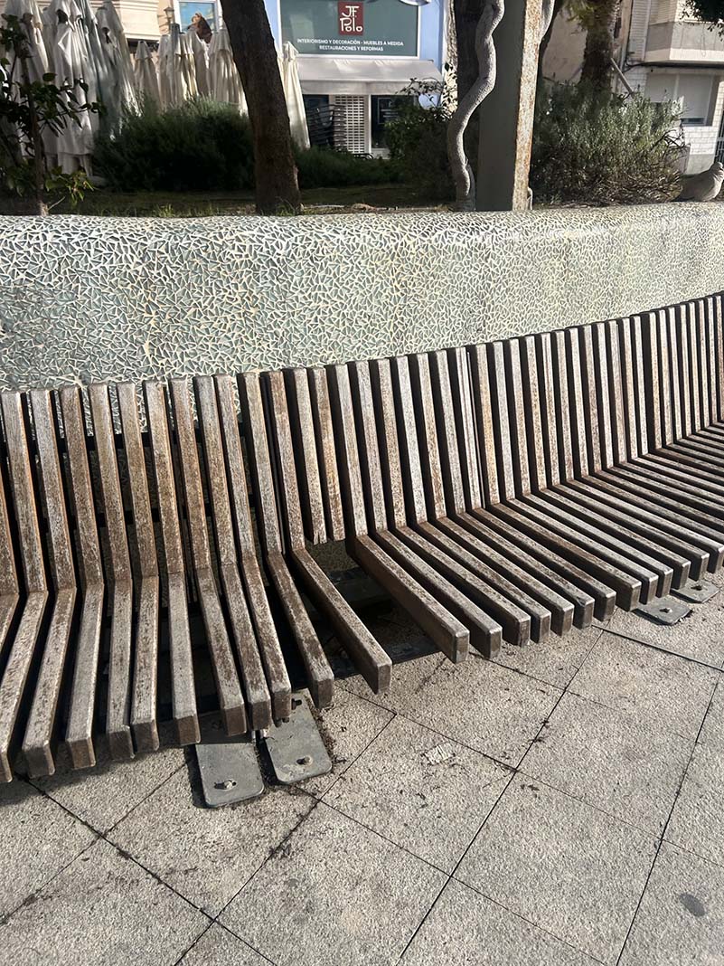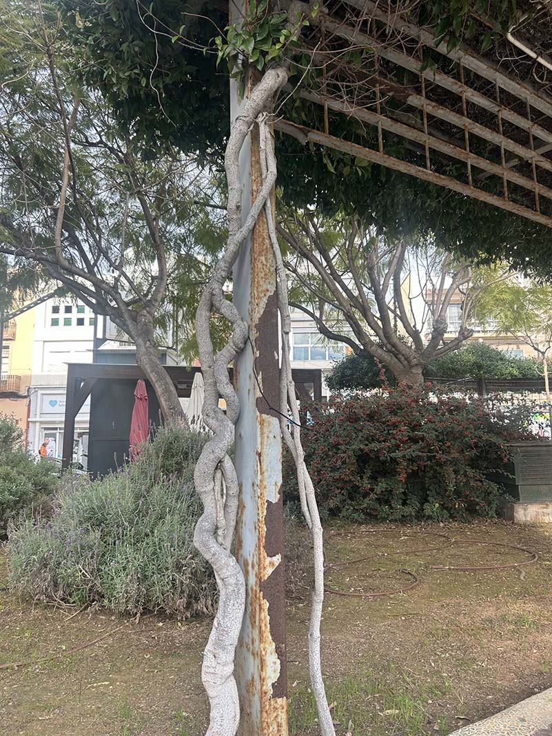 La font verda i rovellada, els banquets cremats i sense pintar. Els ferros rovellats.
