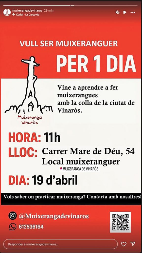 Us podeu posar en contacte amb la Muixeranga de Vinaròs a través del seu perfil d’Instagram @muixerangadevinaros, trucant al telèfon 612536164 o a través del codi QR que trobareu en la foto.