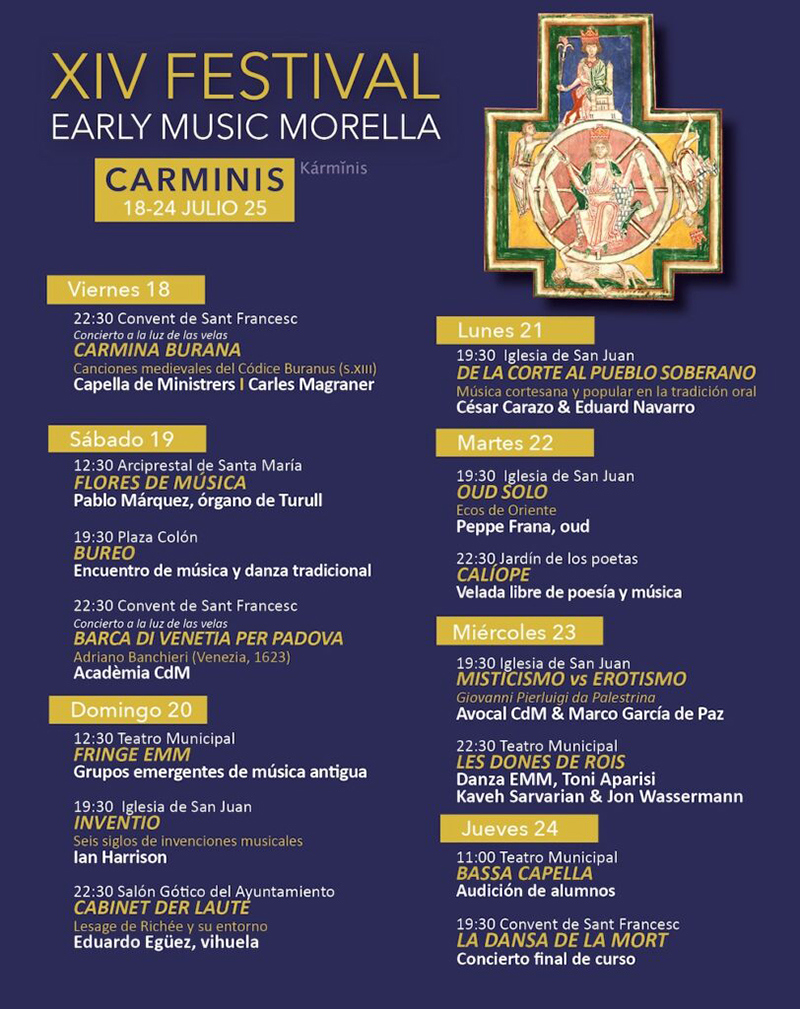 Early Music Morella, Curso y Festival Internacional de Música Medieval y Renacentista, que organiza la Asociación Cultural Comes y la Fundación Cultural CdM, llega a su ecuador con música cortesana y popular, andalusí, las obras del reconocido compositor italiano Giovanni Pierluigi da Palestrina, del siglo XV y la danza contemporánea. El acontecimiento cultural sigue desarrollándose en diversas ubicaciones históricas de la ciudad de Morella (Castellón) hasta el día 24 de julio.