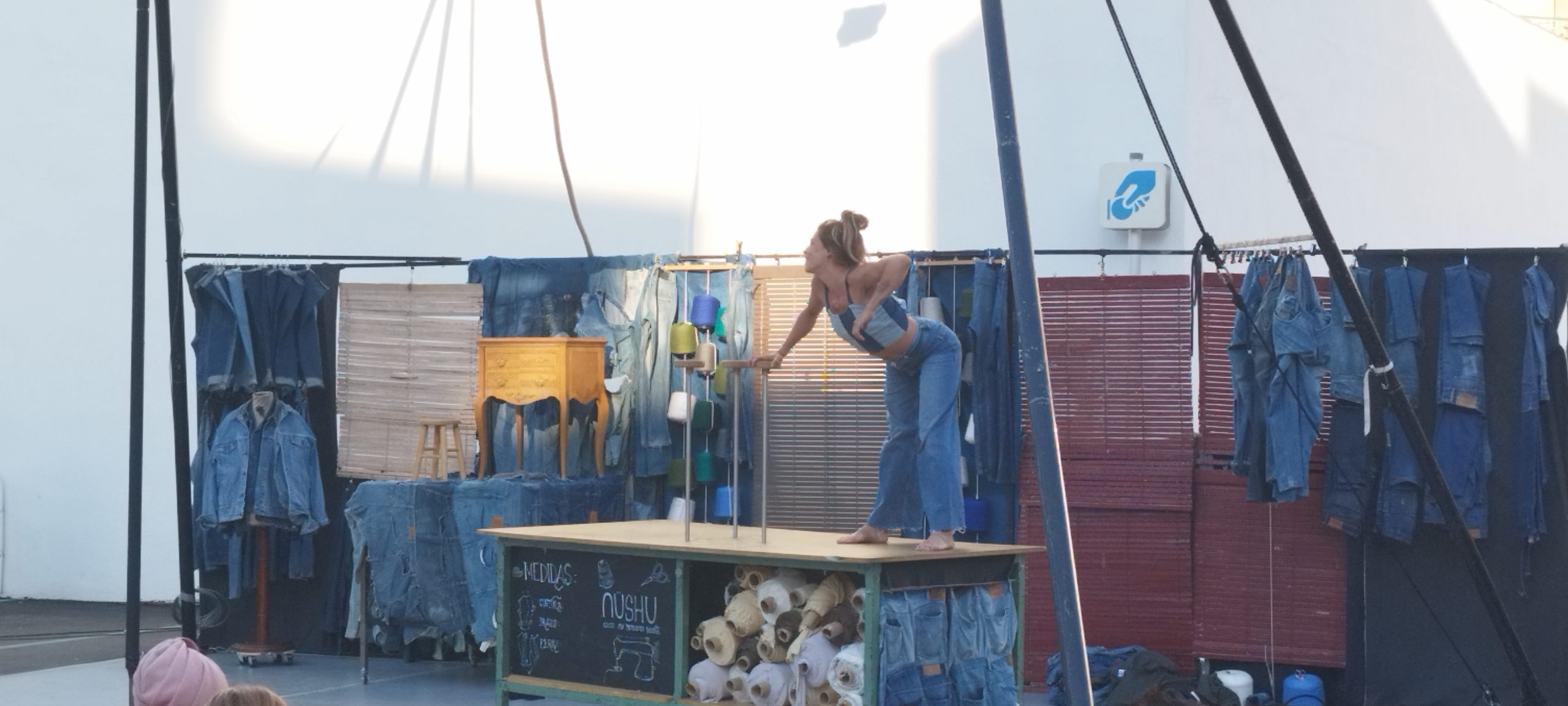 Una fàbrica antiga, una màquina de cosir, una escala àeria, roba reciclada, un pal, bobines de fil, una corda i cinc dones. Acròbates que cusen, ballen, riuen i s’ enfilen.