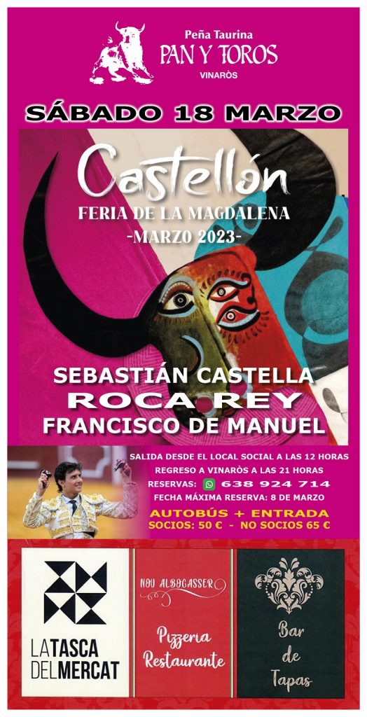 Él próximo sábado 18 de Marzo, la Peña Taurina Pan y Toros viajará a la capital de la provincia para ver al torero que acapara todas las miradas en la actualidad Roca Rey, que hará el paseíllo junto al francés Sebastian Castella, quien se negara a matar al toro “Lujoso” en Vinaròs el 24 de Junio de 2018, debido a su excelente bravura, y a Francisco de Manuel, torero revelación del pasado año. Los tres diestros estoquearan un encierro de Olga Jimenez, procedencia Jandilla.