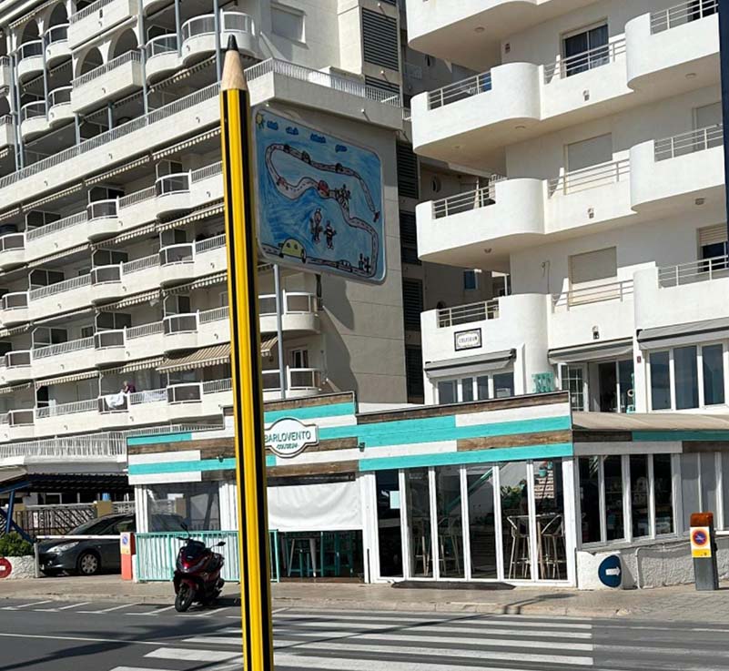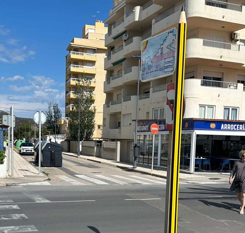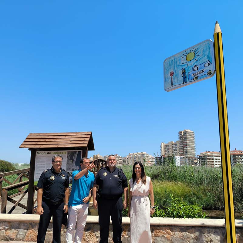 - Tras las clases de educación vial impartidas en el CEIP Jaime Sanz por parte de la Policía Local de Peñíscola, se convocó un concurso a través del cual se obtuvieron varios dibujos que hoy lucen en las señales de la vía pública indicando el itinerario de la Ruta Escolar.