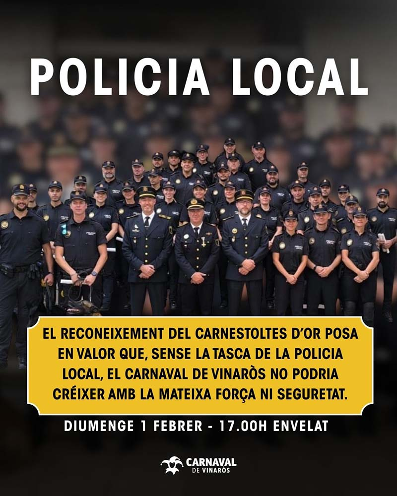 En aquesta ocasió ha sigut guardonada la Policia Local de Vinaròs. En el comunicat de presentació, el Carnaval assegura que aquest guardó és “en reconeixement a molts anys de treball, dedicació i compromís amb la festa“, a més d’assegurar que la Policia realitza “una tasca constant i sovint invisible, però imprescindible perquè el Carnaval es puga viure amb seguretat, convivència i alegria“.