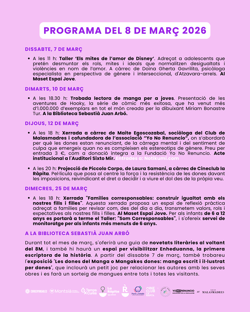 I finalment, programa també inclourà, el 25 de març a les 18 h al Maset Espai Jove, la xerrada “Famílies corresponsables: construir igualtat amb els nostres fills i filles”, un espai de reflexió pràctica adreçat a famílies per analitzar com, en el dia a dia, es transmeten valors, rols i expectatives als fills i filles. Paral·lelament, per als infants de 6 a 12 anys es realitzarà el taller “Som Corresponsables”, i també s’oferirà servei de monitoratge per als infants més menuts, per facilitar la participació de les famílies.