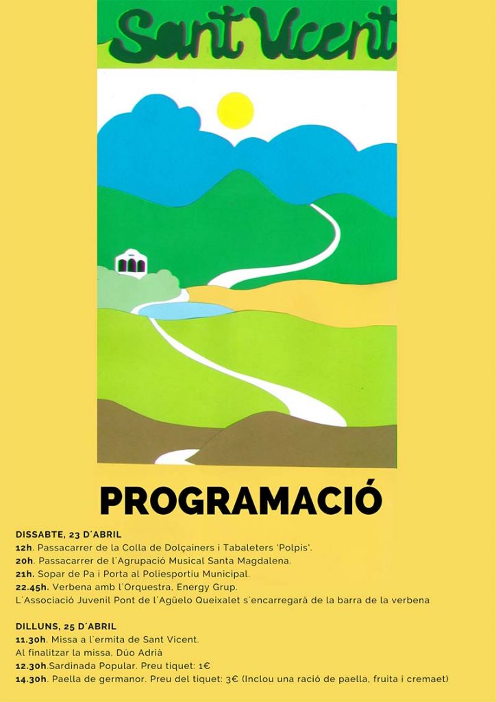 El dilluns, 25 d’abril, a les 11.30h. tindrà lloc la missa en honor a Sant Vicent en l’ermita i després d’ella el Duo, Adrià, amenitzarà la jornada, que prosseguirà a les 12.30h amb una sardinada, que el seu tiquet és d’1 €/ració i a les 14.30h es realitzarà una paella de germanor al preu de 3€/tiquet, que inclou plat de paella, fruita i ‘cremaet’.