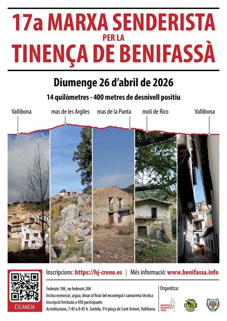 Després de setze edicions plenes d’èxit i participació, la marxa regressa en la mateixa filosofia de sempre: caminar, compartir i descobrir alguns dels racons més espectaculars d’aquest territori únic. Organitzada per l’Associació per la Recuperació de la Tinença de Benifassà, el C.E. Refalgarí de la Sénia i l’Aula de Natura de Vinaròs, la marxa s’ha consolidat com una cita imprescindible per aquells que volen conèixer la Tinença de Benifassà de prop, a peu i en bon ambient. Els qui ja han participat en edicions anteriors ho saben bé: la Marxa Senderista per la Tinença és molt més que una caminada. És una jornada de germanor, panoràmiques i descoberta que any rere any deixa records inesborrables entre senders, miradors i pobles de pedra.