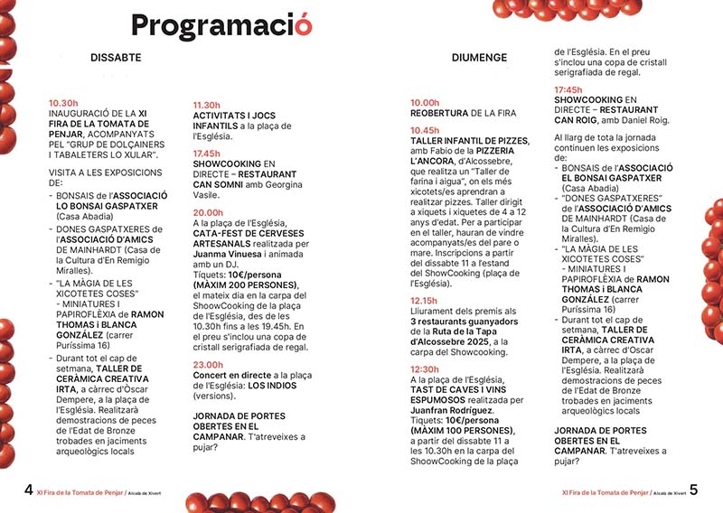 A nivell gastronòmic, la fira es completa amb els showcookings, hui dissabte a les 17.45h a càrrec de Georgina Vasile de Can Somni i el diumenge, a la mateixa hora, amb Dani Roig de Can Roig. També se celebrarà un tast de cerveses, a les 20.00h d’avui dissabte i un tast de caves i vins espumosos demà diumenge a les 12.30h. A més, restaurants d’Alcalà i Alcossebre ofereixen els seus menús a base de tomata de penjar.