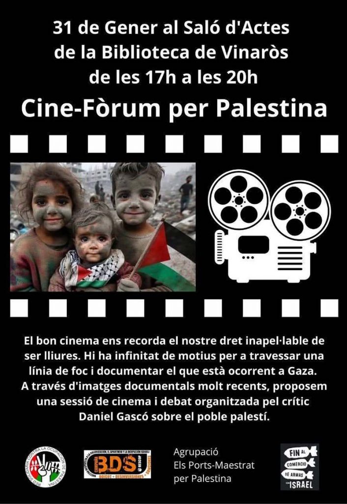 A través de les seves xarxes socials, l’Agrupació Els Ports – Maestrat per Palestina ha anunciat que el pròxim divendres 31 de gener se celebrarà un cine-forum al Saló d’Actes de la Biblioteca Municipal.
