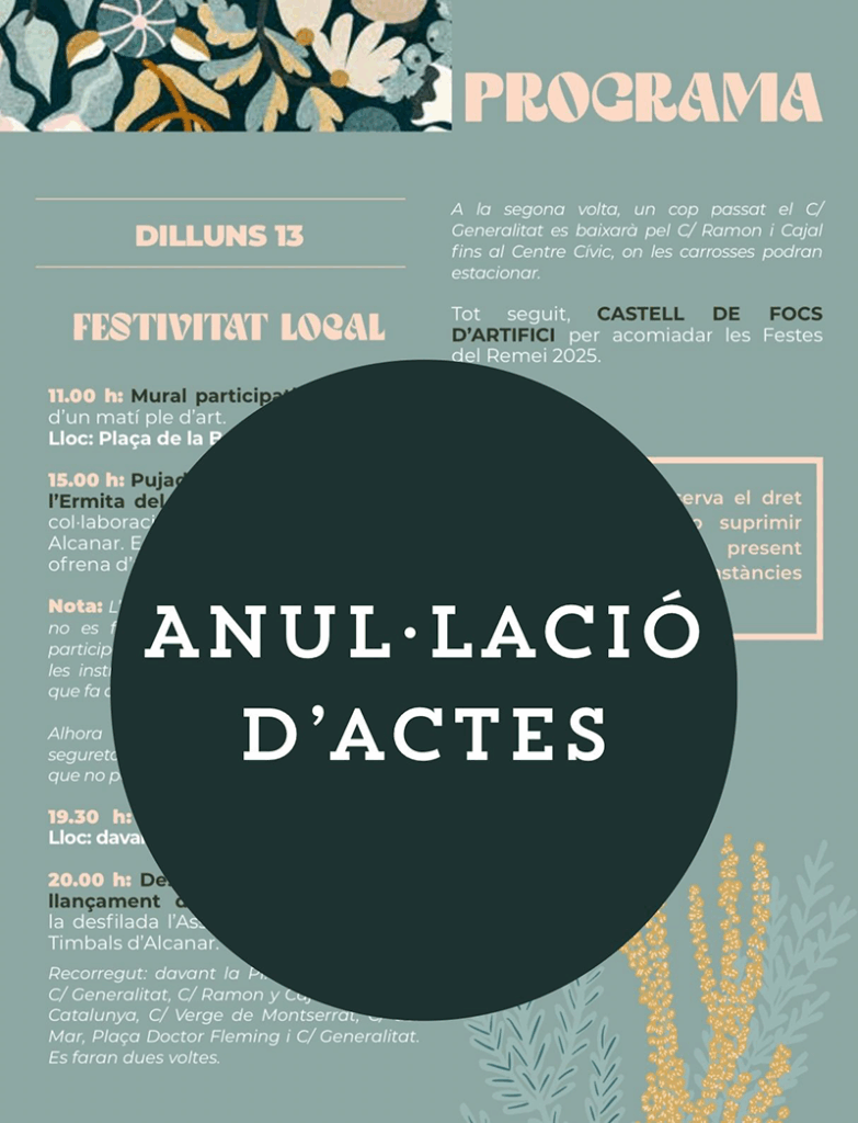 L’Ajuntament d’Alcanar informa que queden anul·lats tots els actes festius previstos per a dilluns 13 d’octubre de 2025