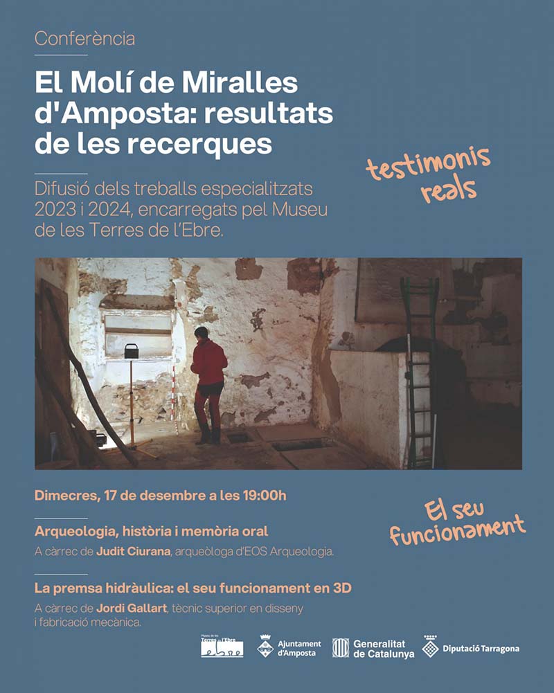 Aquest dimecres 17 de desembre, a les 19 hores, el Museu de les Terres de l’Ebre acollirà la presentació pública dels resultats dels treballs realitzats al voltant del Molí de Miralles durant els anys 2023 i 2024. Les recerques han estat encarregades pel Consorci del Museu de les Terres de l’Ebre i es presentarà en dos grans blocs. El primer, “Arqueologia, història i memòria oral”, a càrrec de Judit Ciurana, arqueòloga de l’empresa EOS Arqueologia, que ha permès reconstruir la història del molí i identificar els elements arquitectònics que caracteritzen i defineixen els diferents moments històrics de l’edifici. La recerca s’ha completat amb entrevistes a persones vinculades al molí en els seus darrers anys de funcionament, que han ajudat a establir-ne el funcionament, a identificar la maquinària emprada en el procés de transformació de l’oli i a constatar que el Molí de Miralles no era només un espai de treball, sinó també un espai de trobada i sociabilitat. El segon bloc porta per títol “La premsa hidràulica: el seu funcionament en 3D” i anirà a càrrec de Jordi Gallart, tècnic superior en Disseny i Fabricació Mecànica, qui ha elaborat una animació en 3D que permet al públic general entendre com funcionava l’antiga premsa de ferro forjat que es conserva a l’interior del molí.