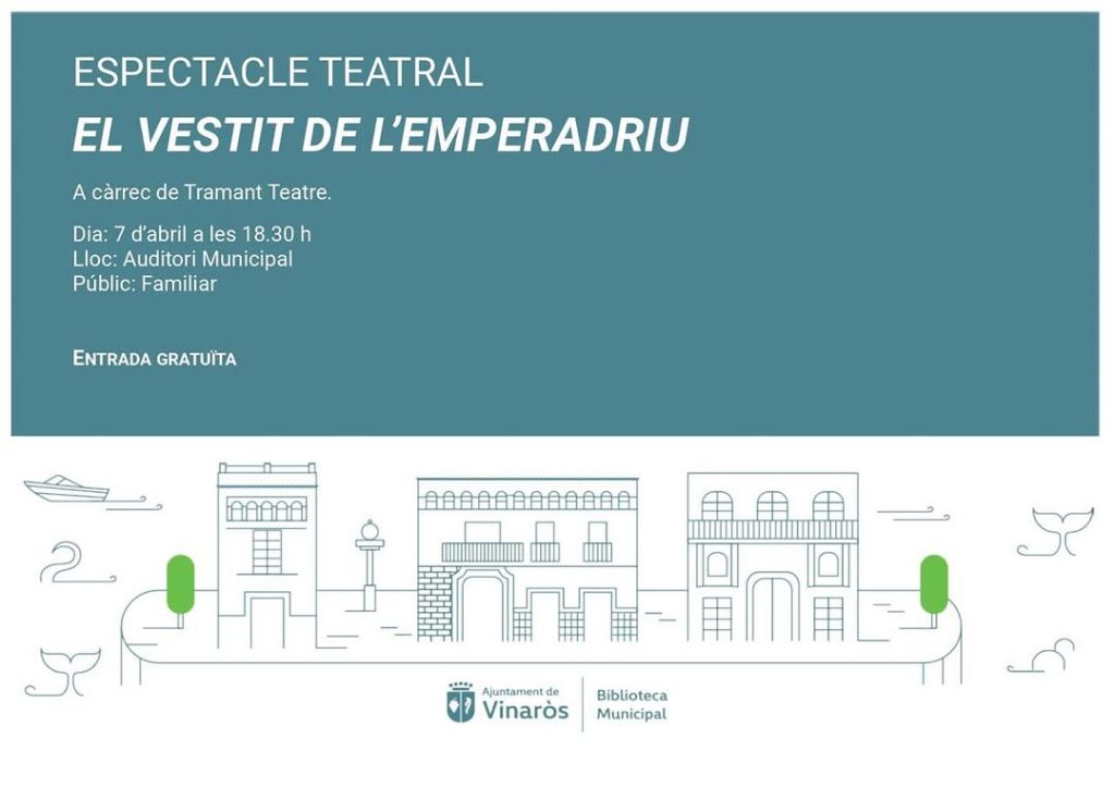 L’Ajuntament de Vinaròs ha presentat, a través dels seus canals de difusió, de la representació a la Biblioteca Municipal de l’obra teatral “El Vestit De L’Emperadriu”, una obra per a públic familiar, i dins de la programació de la IIIª edició de la Festa del Llibre.
