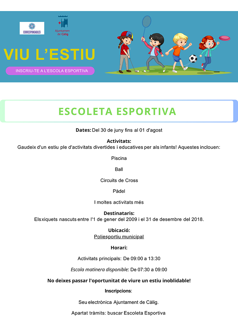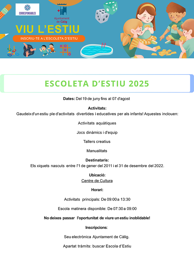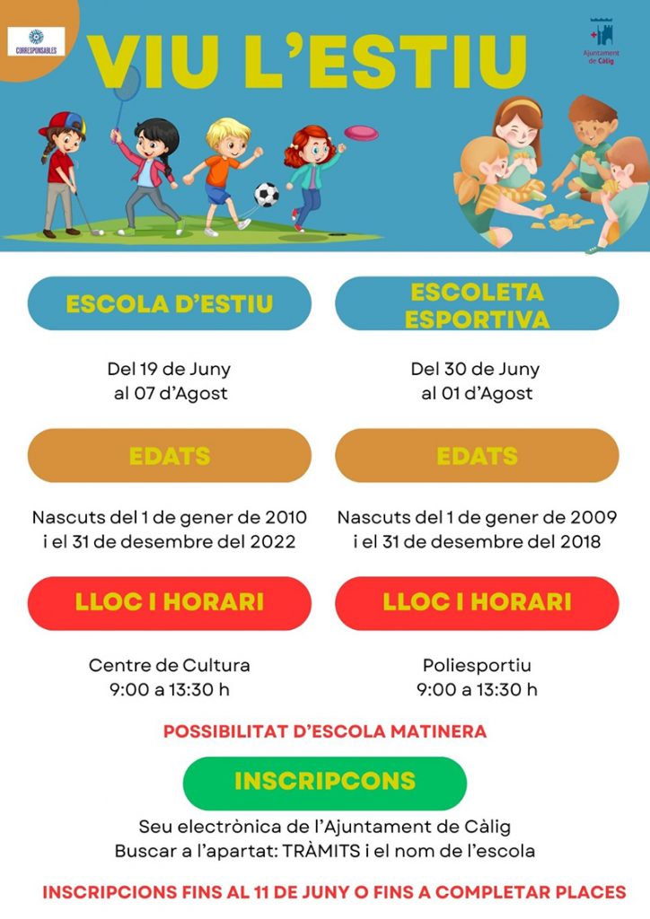 L’Ajuntament de Càlig oferirà un any més les Escoletes d’Estiu perquè els xiquetes i xiquetes puguen gaudir d’un oci educatiu durant les vacances, al mateix temps que s’ajuda als pares i mares a conciliar la vida laboral amb la familiar. Amb el lema Viu l’Estiu s’oferiran dues alternatives, l’Escola d’Estiu i l’Escola Esportiva.