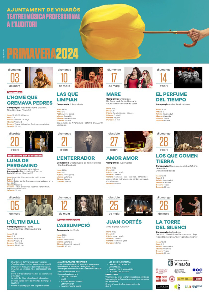 La programació començarà el diumenge 3 de març amb L’home que cremava pedres de la companyia Teatre de l’home dibuixat de Tián Gombau, una proposta intimista adreçada per al públic infantil que buscarà la participació activa dels xiquets. Una de les obres més destacades serà la que s’oferirà el diumenge 21 d’abril amb L’enterrador de la companyia Coproducció de Teatre de dos i Cía. Mediterránea, en aquest cas una representació que tractarà de la història i el sistema que s’utilitza per a identificar i acomiadar als morts de la Guerra Civil de les foses comuns.