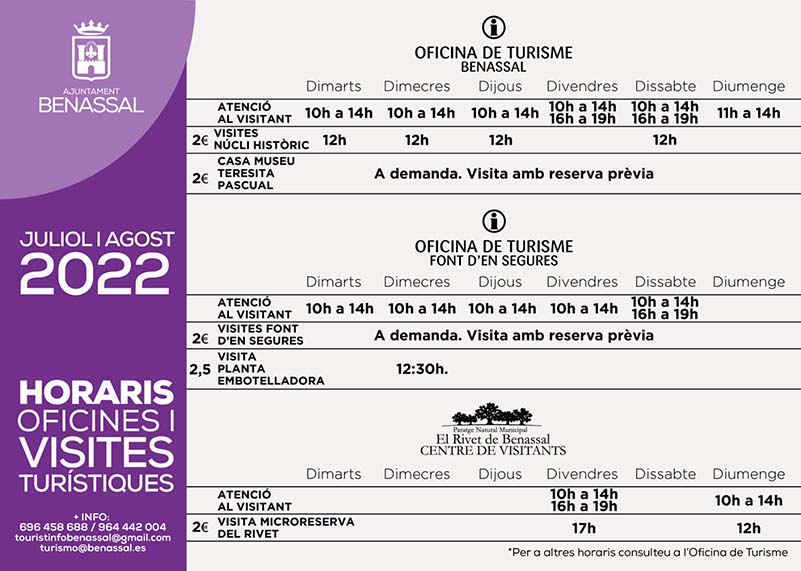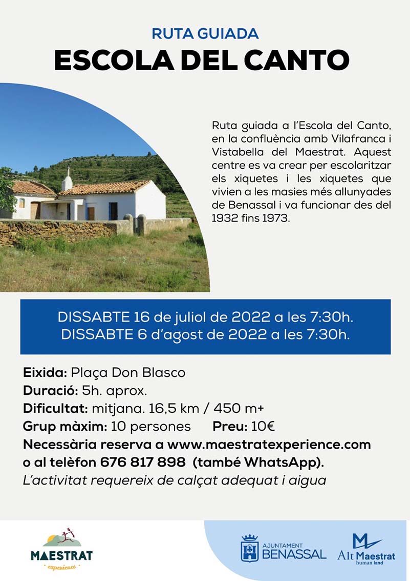 A Benassal han organitzat una excursió per aproximar-se a l’Escola del Canto i viure de primera mà com escolaritzaven fa quasi un segle els xiquets i xiquetes que vivien en les masies més allunyades de Benassal. L’activitat tindrà lloc el dissabte 6 d’agost. l com la cosa sembla que va d’excursions i rutes a Benassal, el dia 4 també s’organitza una altra excursió: la ruta dels guerrillers. I el dia 6 també eixirà un grup per a gaudir de la pedra seca. Per últim i de manera complementària, l’Oficina de Turisme de Benassal oferirà les seues populars visites guiades al nucli històric, a la Casa Museu Teresita Pascual, a la Font d’En Segures, a la Planta Embotelladora i a la Microreserva Del Rivet.