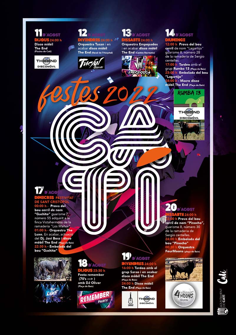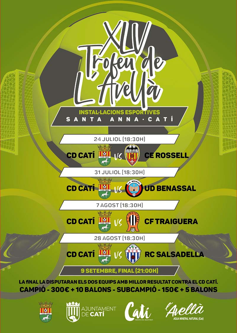 Catí, ja està a l’espera de celebrar els gols de la tercera jornada del XLV Trofeu de l’Avellà. Un torneig de futbol que ja està arribant a la final i que este diumenge enfrontarà el CD Catí contra el CF Traiguera. Això sí, a Catí tenen un altre ull mirant cap a les seues festes 2022, que comencen el dia 11. D’esta manera, cartells plens d’activitats, festa, balls i sopars ja estan quedant al descobert per gaudir de la setmana més especial per a Catí.