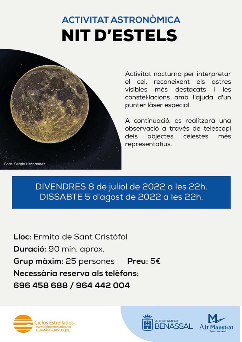 Per segona volta, Benassal organitza una excursió nocturna per conéixer i descobrir els secrets que s’amaguen en el fosc cel de l’Alt Maestrat. Així, el dia 5 d’agost tindrà lloc una activitat que enssenyarà a interpretar el cel amb l’ajuda d’un telescopi i d’un punt làser especial de manera que cap astre, constel·lació o objecte celeste passarà inadvertit.