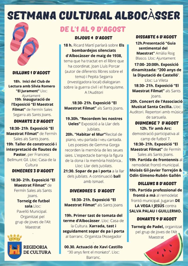 Si una cosa li agrada als veïns i veïnes de l’Alt Maestrat és la cultura. Cada setmana, activitats de tots els tipus, gèneres i tradicions aterren als municipis del territori Human Land per omplir de vida i alegria els seus carrers. Esta setmana, Albocàsser ho aposta tot per la cultura amb la seua setmana cultural que te lloc des de l’1 d’agost fins al dia 9. Un conjunt d’activitats com exposicions, tallers musicals, literatura, recitals, balls, futbol, pàdel, frontò, gastronomia i concerts ompliran les agendes dels residents i visitants. A més, a Albocàsser pareix que no els semblava prou i encara han afegit un dia més de la mà de la cultura, específicament de la música espanyola. Dissabte 6 d’agost, a l’Auditori Municipal, tindrà lloc un espectacle amb palmes, ritmes i melodies arrelats a la nostra història.