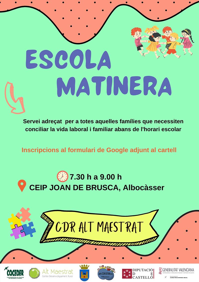 Setembre és sinònim d’inicis i aprenentatge. Per això, els més menuts tornaran a gaudir de la possibilitat de passar els matins en l’escoleta matinera, de les 7.30h fins a les 9h. Així, totes aquelles famílies que necessiten conciliar la vida laboral i familiar abans de l’escola ho poden fer gràcies al Centre de Desenvolupament Rural (CDR) Alt Maestrat. Pel que fa a Albocàsser, s’han obert les inscripcions per al curs 2022/2023 en el CEIP Joan de Brusca.