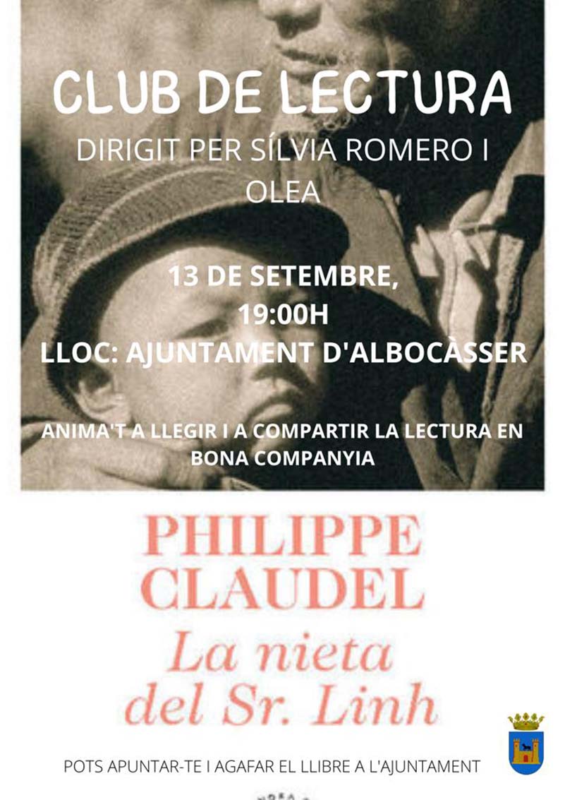 Les arts culturals estaran una setmana més ben presents en l’agenda d’activitats. L’Ajuntament d’Albocàsser acollirà este 13 de setembre a les 19h la lectura i anàlisi del llibre ‘La Nieta del Sr. Linh’, escrit per Philippe Claudel.