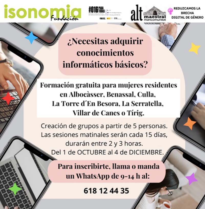 D’altra banda, a Albocàsser, a Benassal, a Culla i a altres pobles s’oferiran cursos totalment gratuïts d’informàtica bàsica per combatre la bretxa digital de gènere i també d’alimentació i cuina saludable.