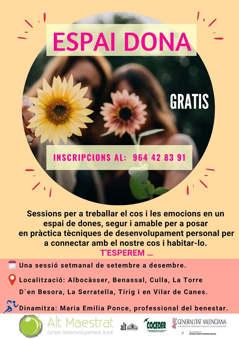 D’altra banda, Albocàsser, Benassal o Culla seran alguns dels pobles que gaudiran d’Espai Dona, un conjunt d’activitats gratuïtes dirigides a dones de l’entorn rural amb sessions per a treballar el cos i les emocions en un espai de dones, segur i amable.