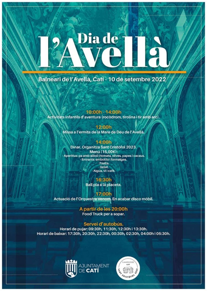 Després, tindrà lloc una missa a l’ermita de la Mare de Déu de l’Avellà. Tot seguit, es gaudirà del popular dinar organitzat per Sant Cristòfol, del ball pla a la placeta i de la música de l’orquestra ‘Venom’ i discomòbil, tot acompanyat de ‘food trucks’ per a sopar.