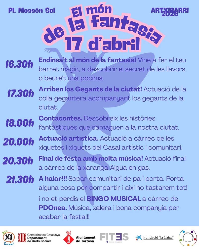 La Xarxa per la Convivència a Tortosa ja ho té tot a punt per a l’ArtXiBarri, que este divendres, 17 d’abril, arriba a la seua catorzena edició. “Serà una tarda-nit plena de tallers, cercavila en los gegants, contacontes, actuacions, un sopar comunitari i un gran final de festa amb música al carrer”, ha explicat l’alcaldessa, Mar Lleixà, qui ha comparegut amb el segon tinent d’alcaldia i regidor d’Acció Cívica i Comunitària, Víctor Grau. La plaça de Mossèn Sol, al barri del Rastre, serà l’escenari de l’ArtXiBarri d’enguany, que tindrà com a eix temàtic ‘El món de la fantasia’.