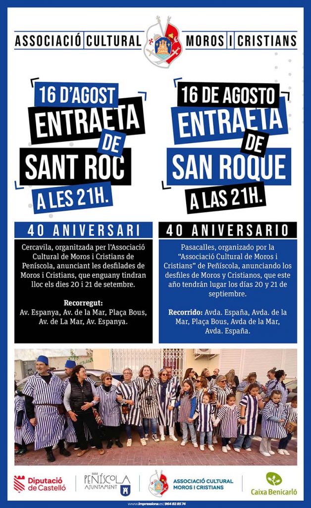 El dia 16 d’agost, festivitat de Sant Roc, l’Associació Cultural de Moros i Cristians de Peníscola organitza, amb la col·laboració de l’excel·lentíssim Ajuntament de la localitat, un aperitiu festiu anunciant les festes de Moros i cristians que enguany se celebraran els dies 19,20 i 21 de setembre.