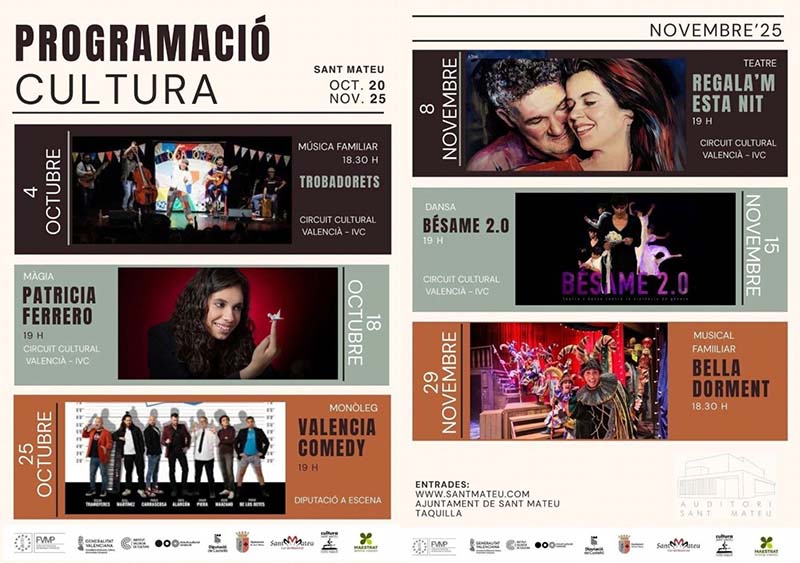 Aquest compromís es va veure reforçat l’any 2019, quan Sant Mateu va entrar a formar part del Circuit Cultural Valencià, un projecte impulsat per l’Institut Valencià de Cultura (IVC), que té com a objectiu afavorir l’accés a programacions culturals estables, variades i de qualitat arreu del territori valencià.