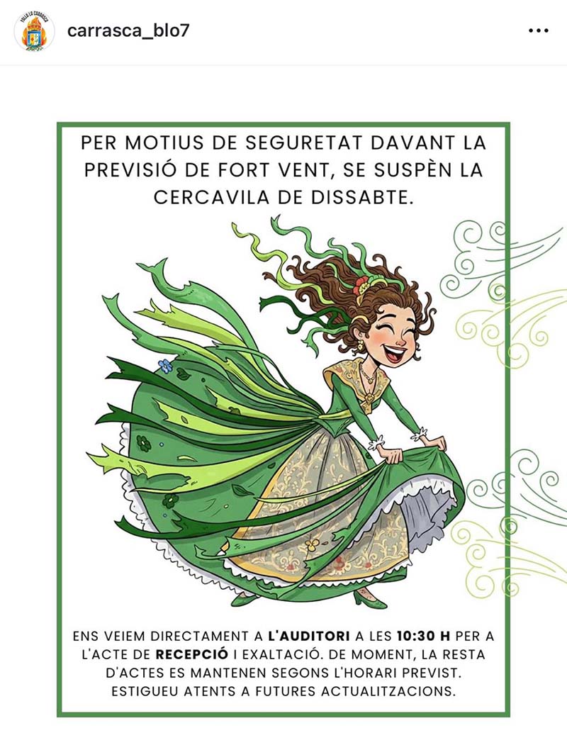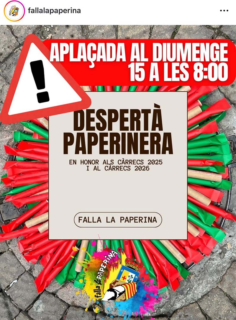 Per la seua banda, la Falla La Paperina, que tenia prevista la celebració de la despertà dissabte, ha acordat traslladar-la a diumenge 15 de febrer a les 8.00 hores.