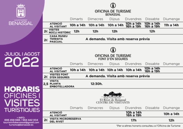 L’Oficina de Turisme de Benassal oferirà les seues populars rutes a la Casa Museu Teresita Pascual, a la Font d’En Segures, a la Planta Embotelladora, a la Microreserva Del Rivet i al nucli històric del poble. També Ares seguirà amb les seues visites guiades per descobrir l’art rupestre de la zona en la Cova Remígia i el Cingle de la Mola Remígia.