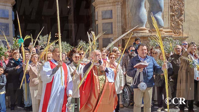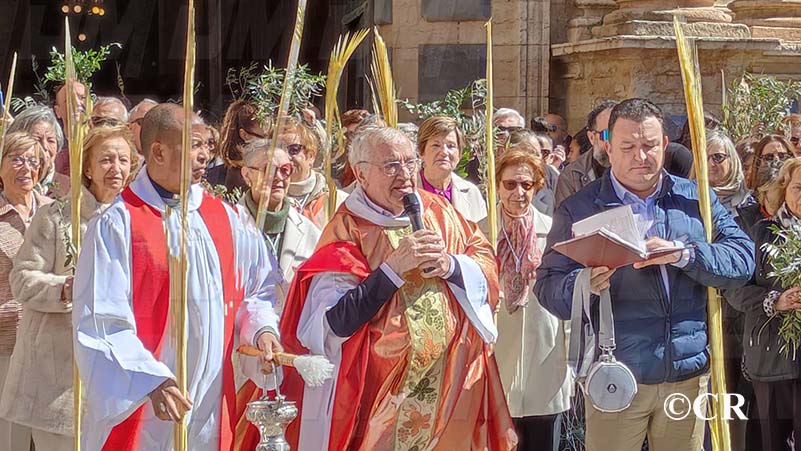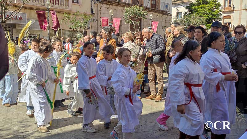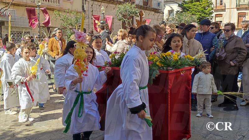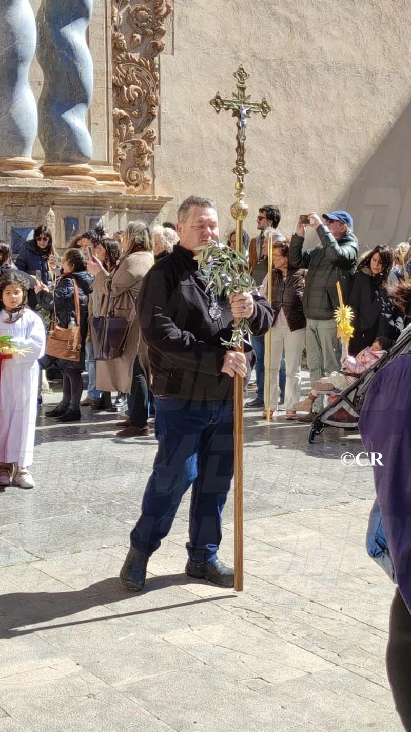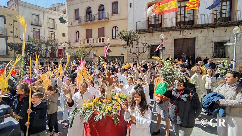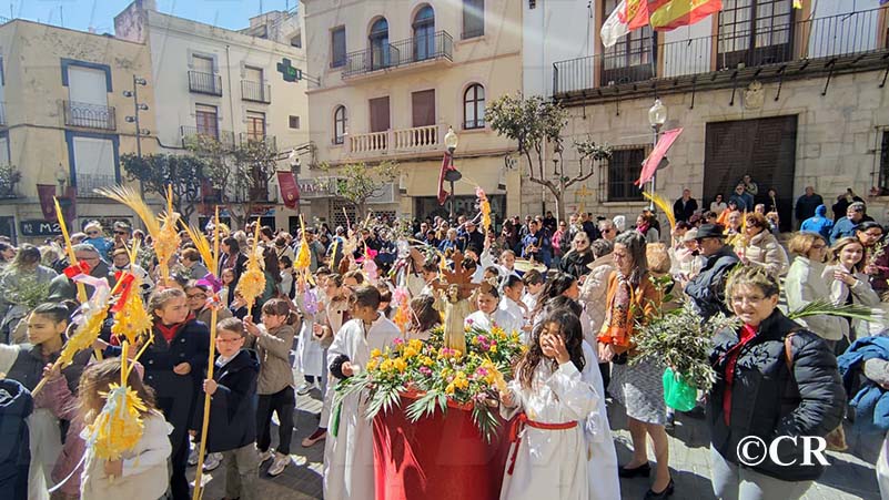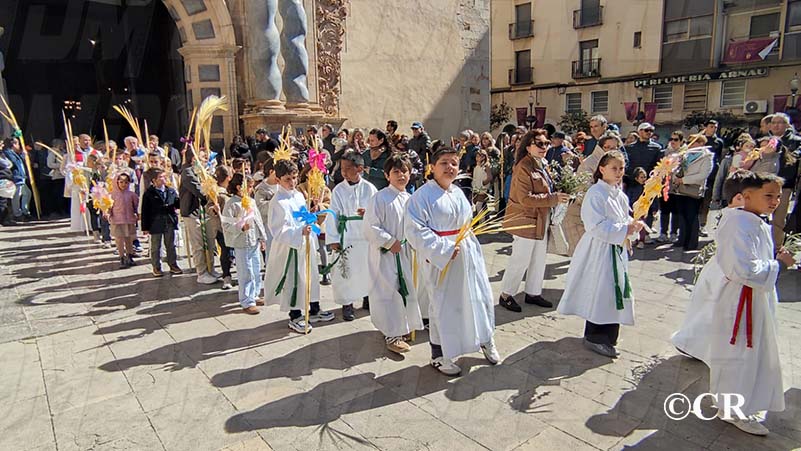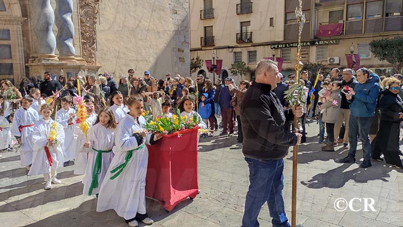 La benedicció dels rams l’ha realitzada mossèn Emili Vinaixa a la porta de l’Església Arxiprestal, acompanyat de tots els xiquets i xiquetes de catequesi, així com dels feligresos de la parròquia.