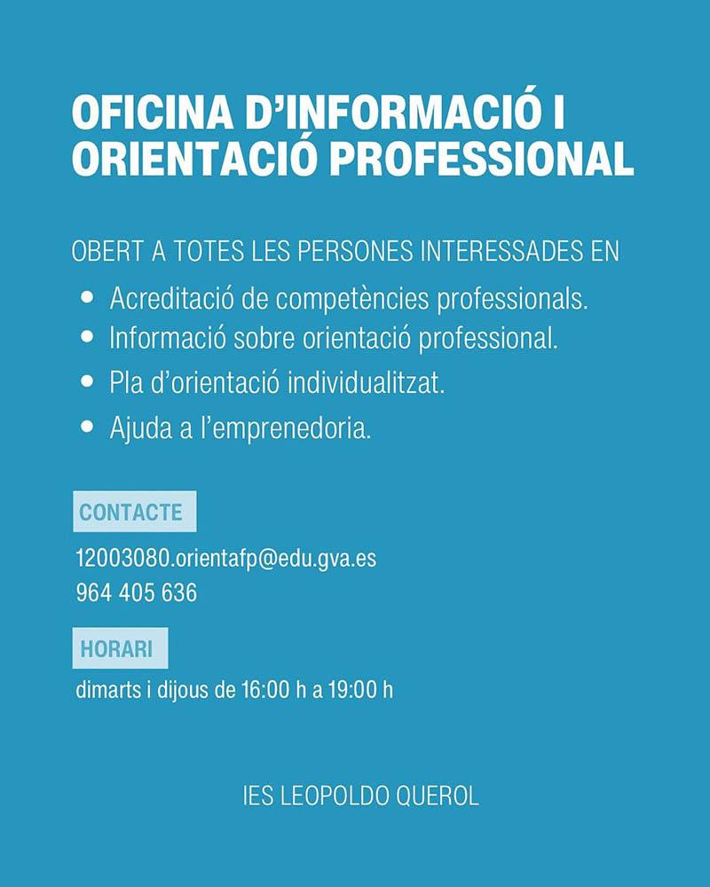 A través de les seves xarxes socials, l’IES Leopoldo Querol ha anunciat la creació d’una oficina d’informació i orientació professional per als cicles formatius. El servei està obert a totes les persones interessades en els següents punts: