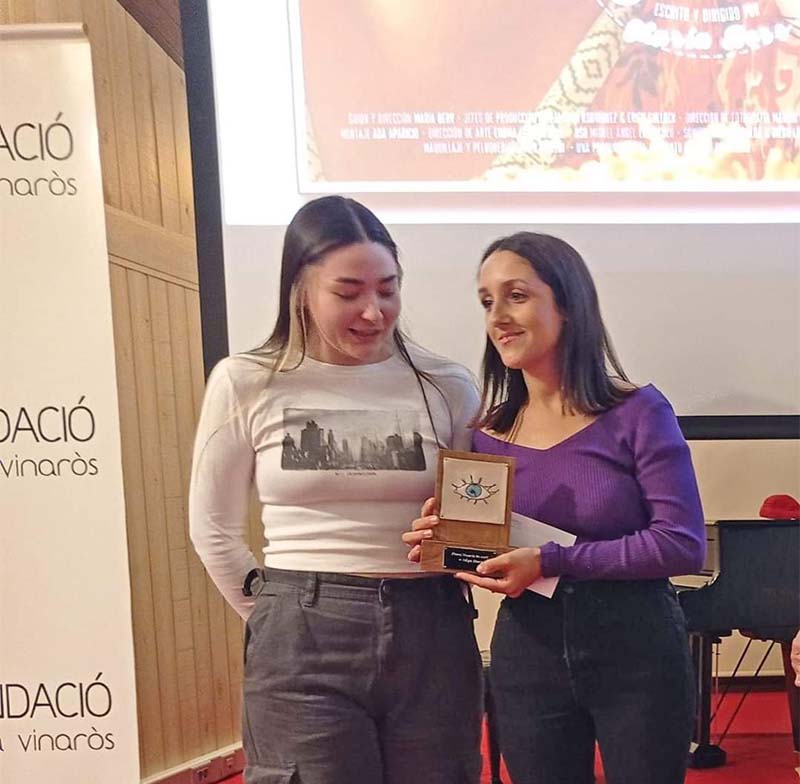 La directora de “Lola tijeras” i Ada Aparicio van rebre el premi, consistent en 600 euros i escultura, de mans de Josefa Gondomar, presidenta de la Fundació Caixa Vinaròs, entitat organitzadora del festival.