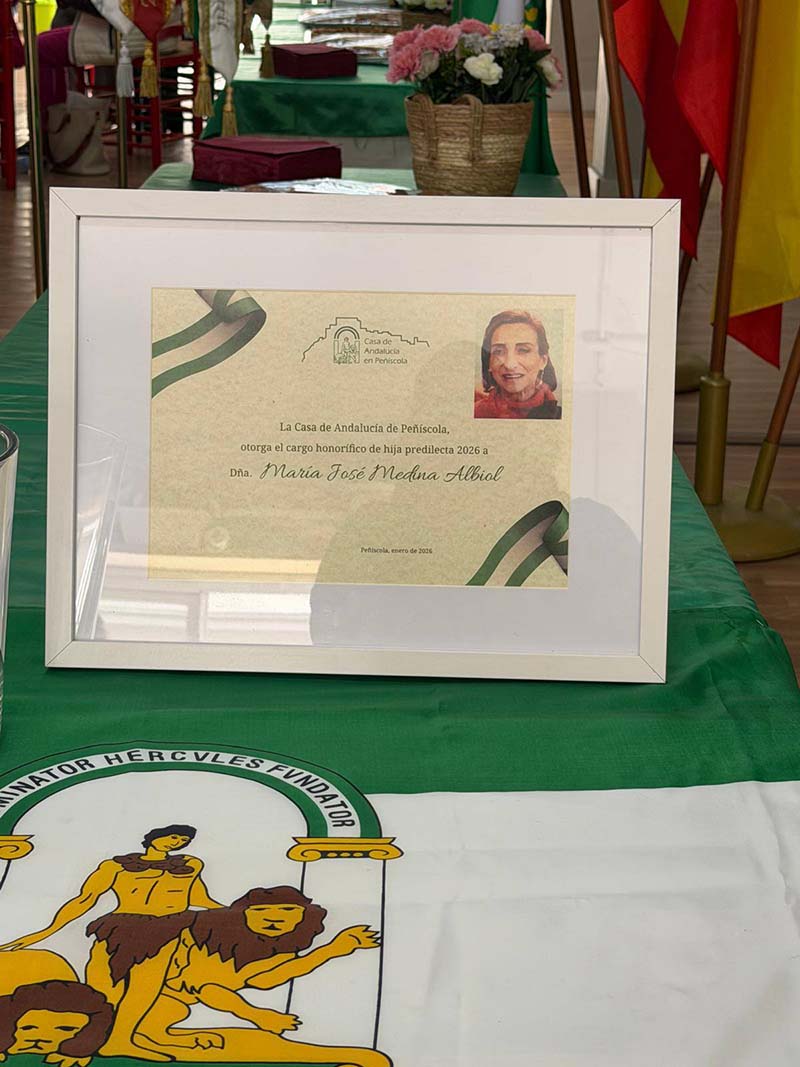 La Casa d’Andalusia a Peníscola comunica que, en el dia de hui, s’ha informat a M. José Medina Albiol del seu nomenament com a Filla Predilecta 2026.