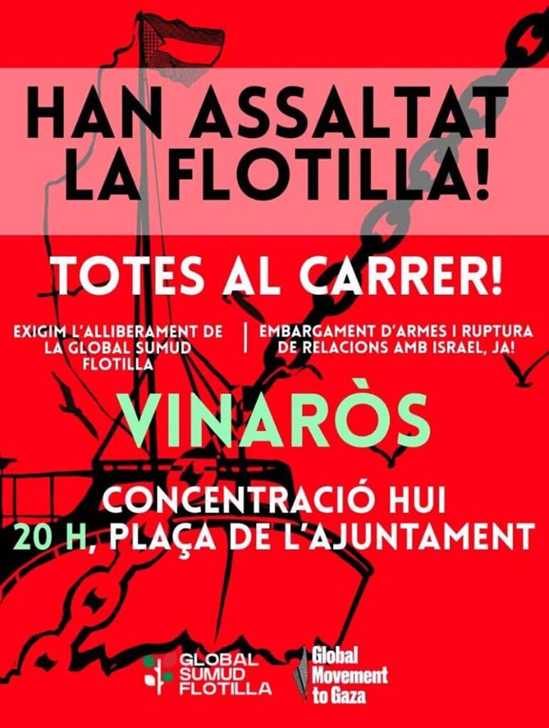 El Grup de Suport a Palestina ha anunciat, a través de les seves xarxes socials, una concentració ciutadana enfront de l’Ajuntament de Vinaròs per donar suport a la Global Sumud Flotilla, després que anit fou interceptada per vaixells israelians en aigües internacionals.