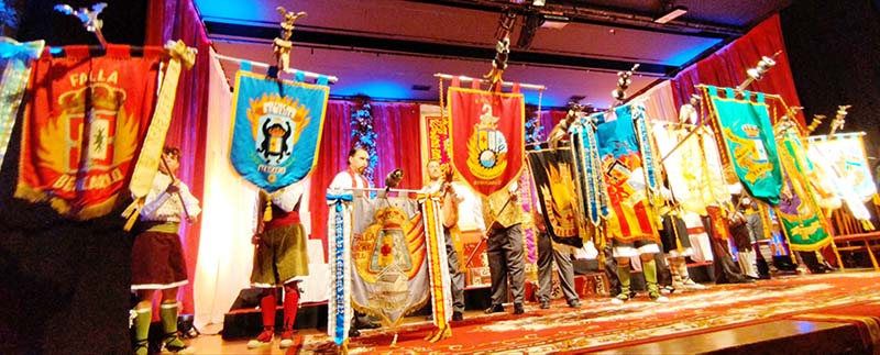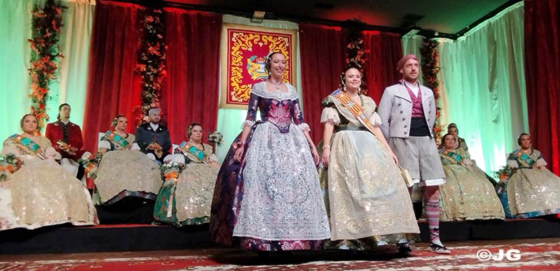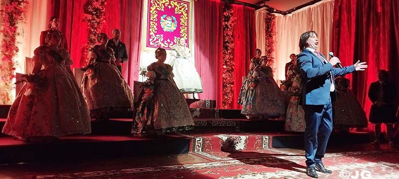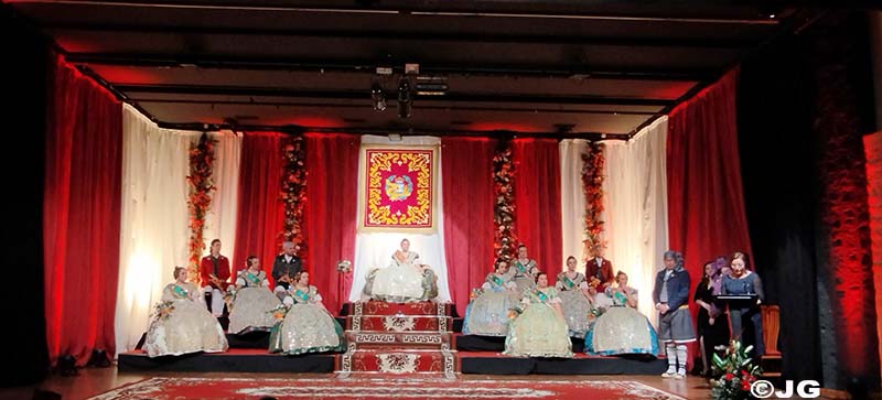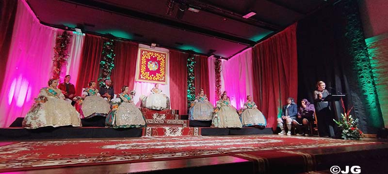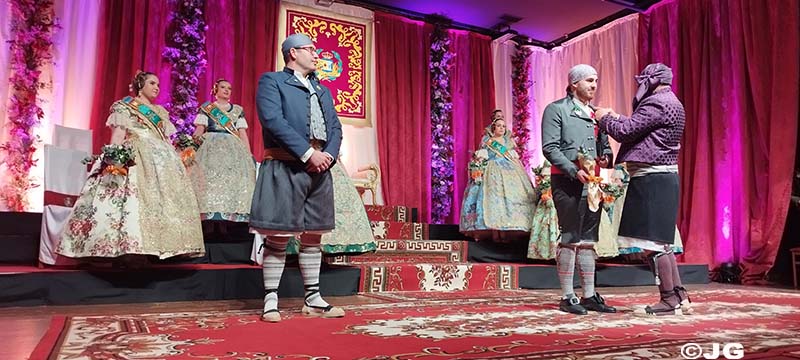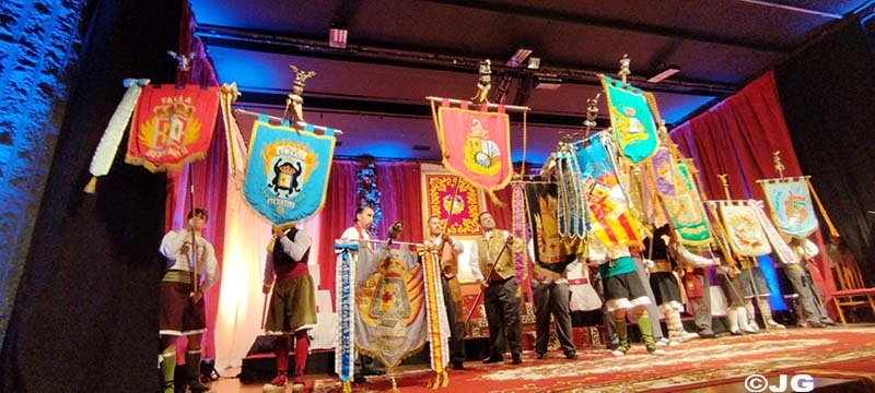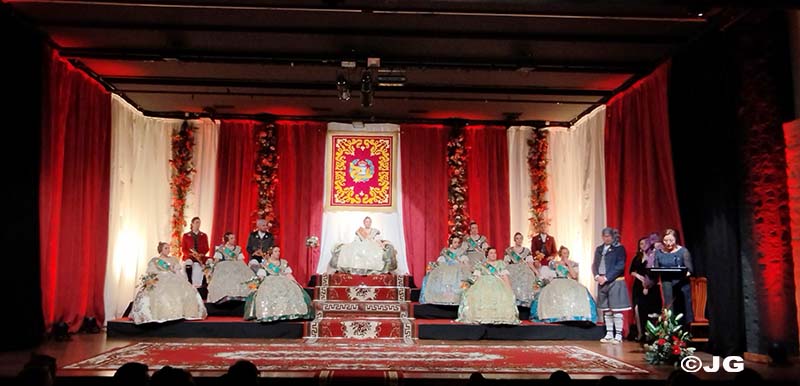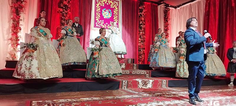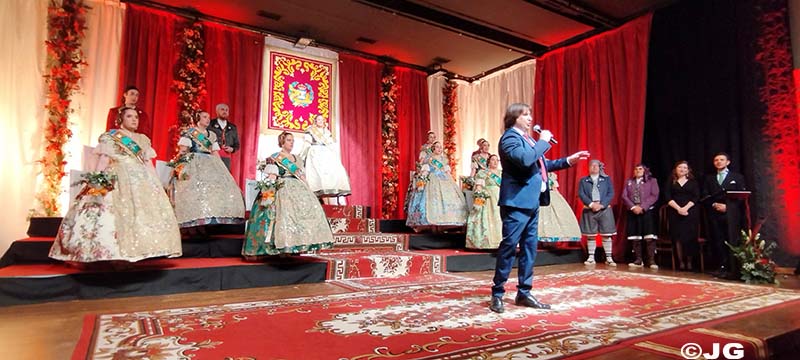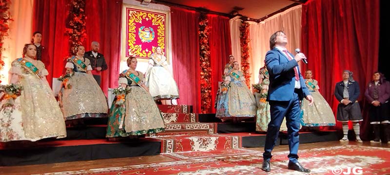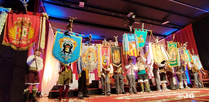 Fan entrada solemne a l’escenari el President i Vicepresident de la Junta Local Fallera, precedits pels 13 estendards de les comissions de la ciutat.