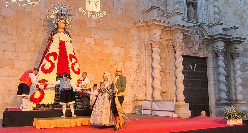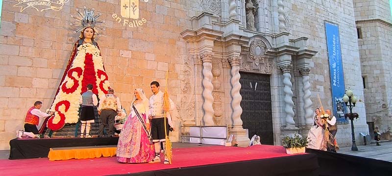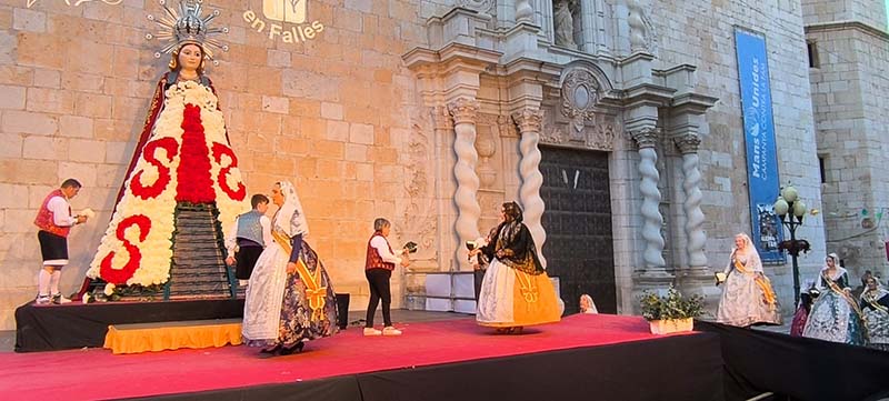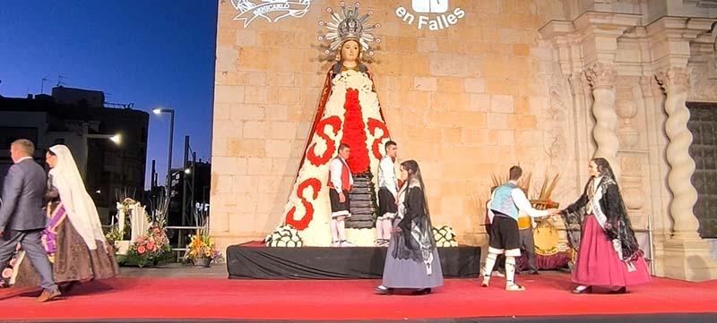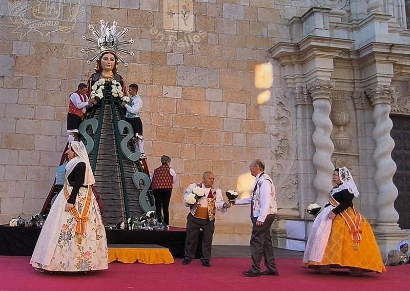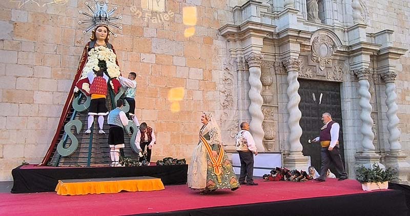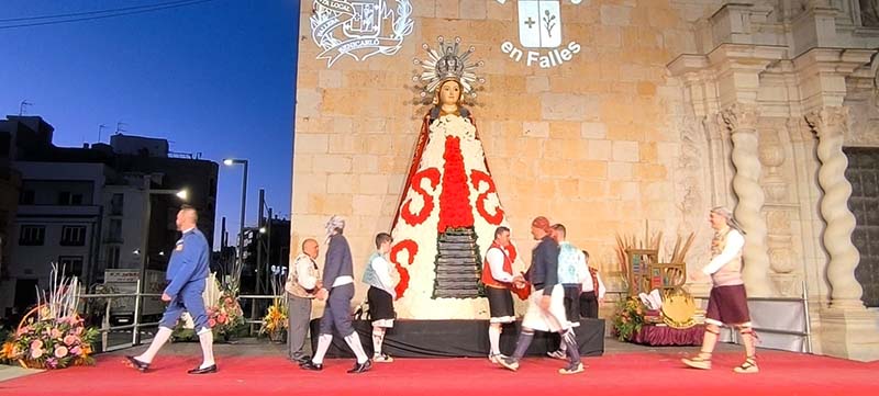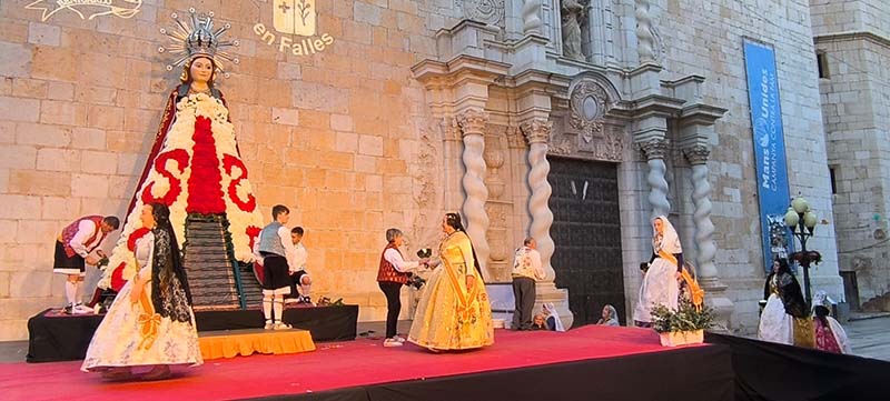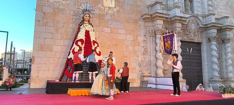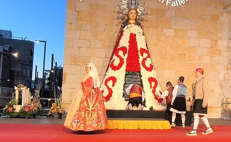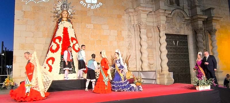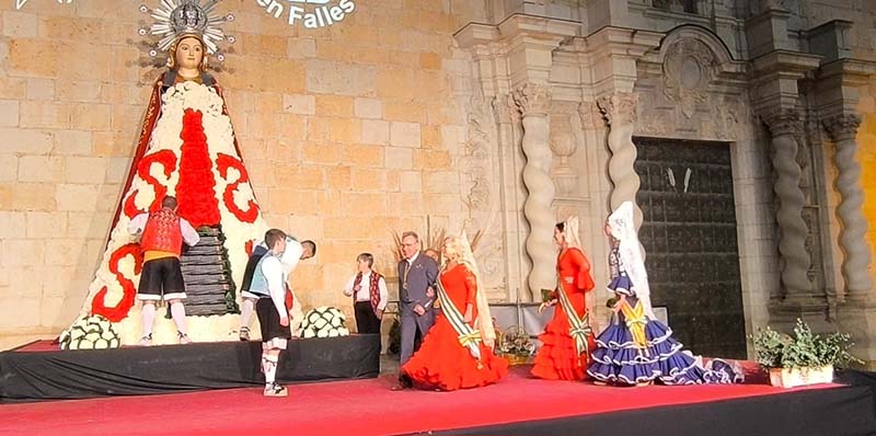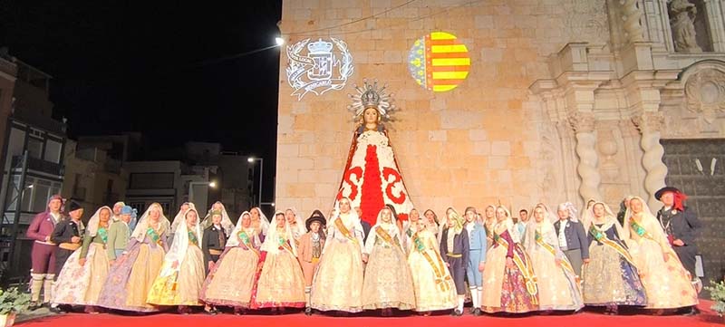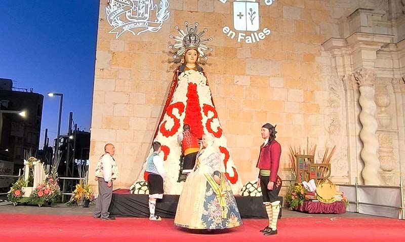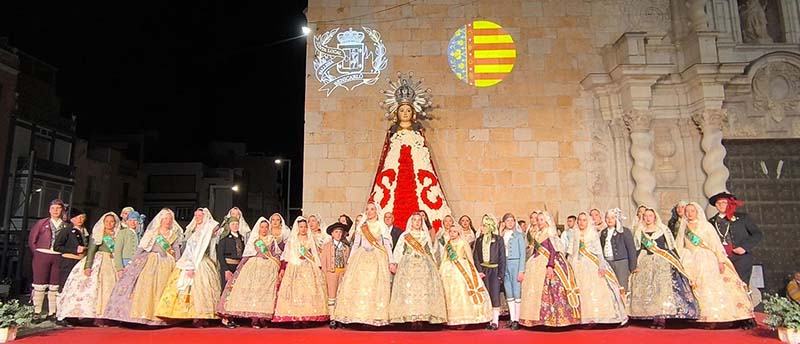 Milers de fallers i falleres han desfilat durant la vesprada per oferir els seus rams de clavells blancs i rojos a la patrona de la ciutat, conformant el tradicional mantell floral davant del temple parroquial.
